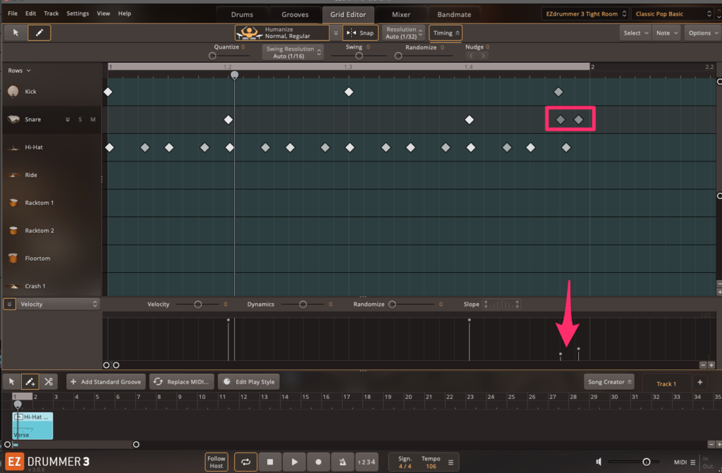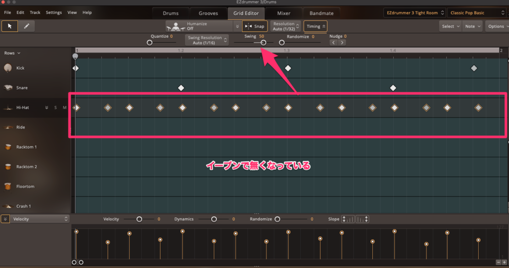 ハイハットのベロシティが変化して、レイドバックした位置になっている。
