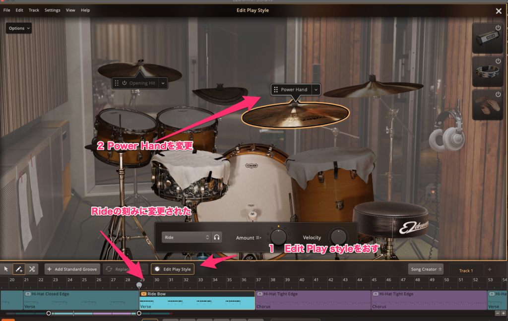 更に凄いのが違うパターンや類似パターン、ハイハットやライドを入れ替えるなんてことも出来ます。