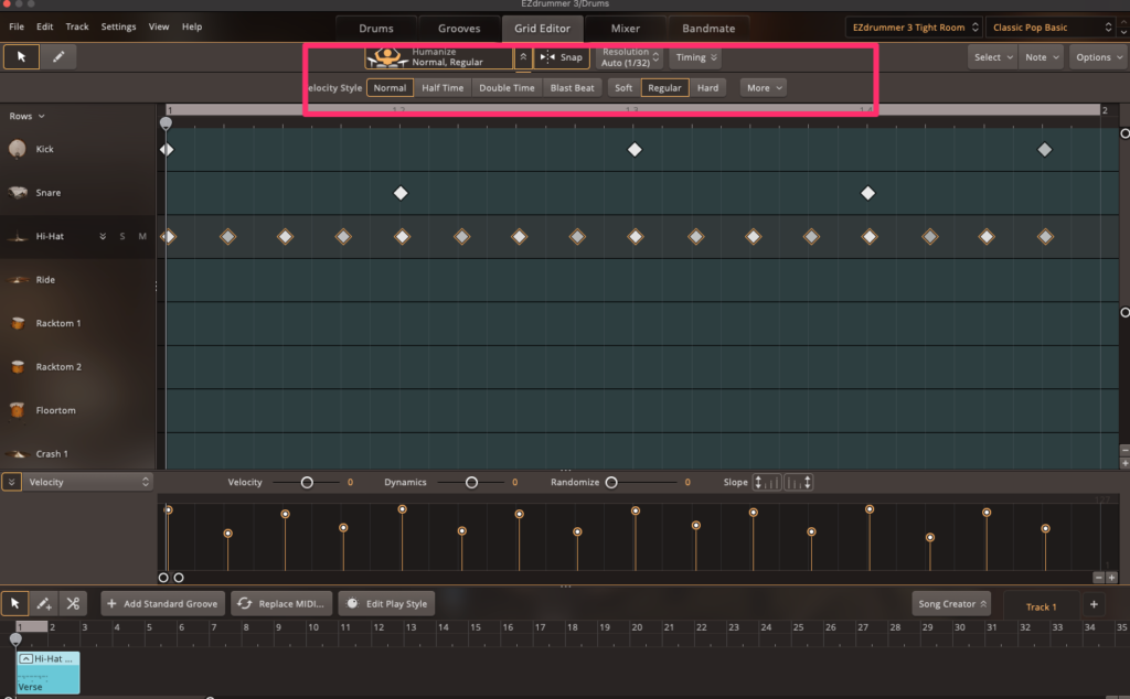 これを見てください。ハイハットのベロシティが変化して、ややレイドバックしていますね。これ、ベタ打ちです。ペンシルツールで書いただけ。かなりナチュラルにベロシティの変化もつけてくれてますね…