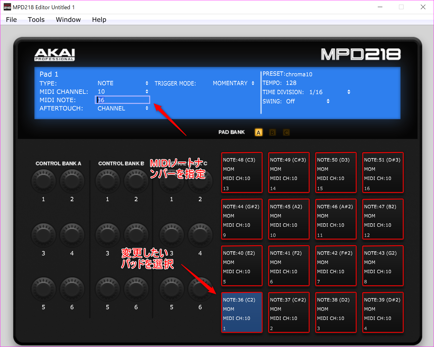 そういう場合はMPD218を半音階のモード(クロマチック)にして使うとええよ。その場合は、ハッドの左隅が最低音になることに注意して。