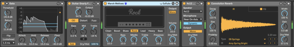 いろいろエフェクター並べてますが、こんな感じです。私、テレキャス使ってて、ノイズが酷いんで、ゲートでちょっとノイズをおさえてから、Pedalのオーバードライブ、それからAmpでRock(プリセットでMarsh Mellowsって書いてありますね)を選択。ノブは全てフルです。
