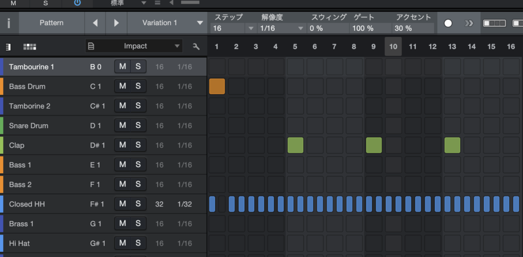 一画面の中に32分音符のグリッドがあるのはわかるでしょうか。トラップみたいなのを作りたい人には嬉しいんではないでしょうか。一画面で完結するなら、音価もいずれは覚えるでしょう。
