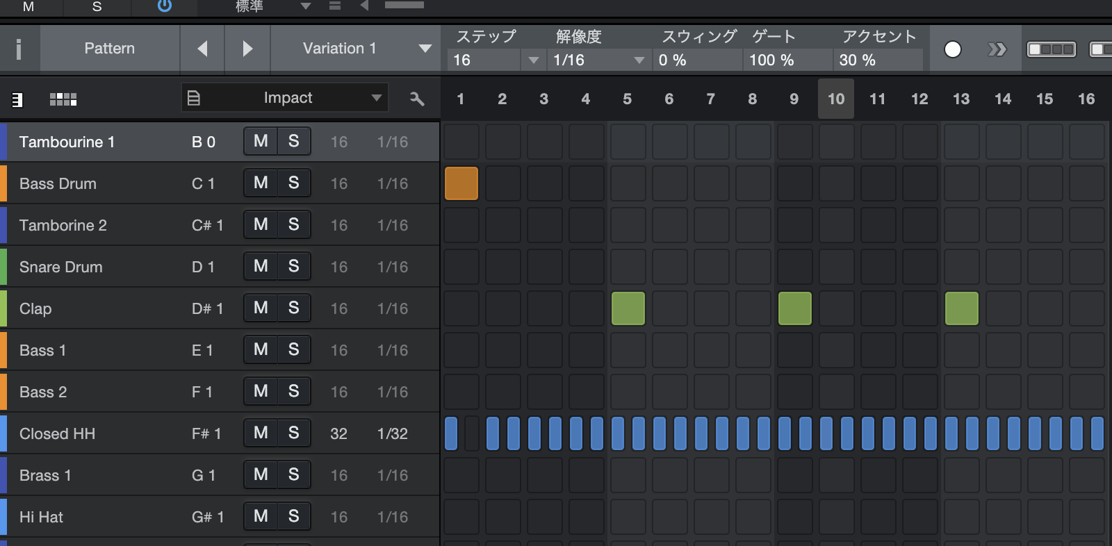 パターンエディタは今まで見たDAWのMIDIシーケンサーの中でもっともドラム打ち込みはやりやすい。