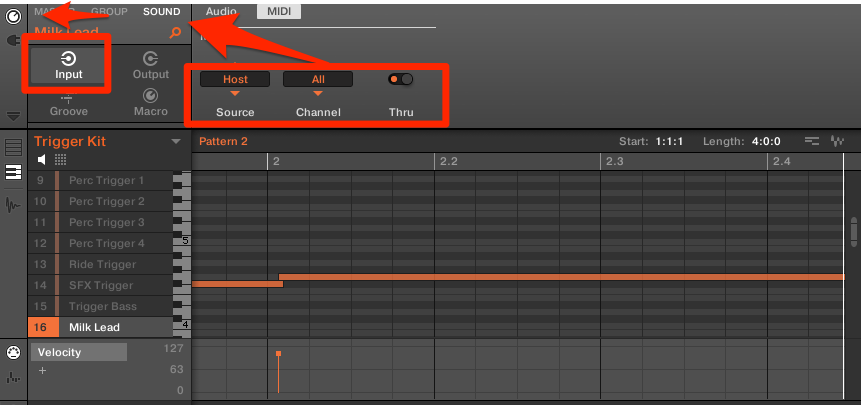Macro(ノブ型のボタンを)を押し、Sound→input→MIDIを選択して、Sourceを「Host」にします。これで安心ですね。