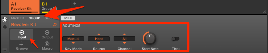 Maschineに入ってきた信号をどの様に処理するかなので「Input」を選択。Keymodeは普通のピアノロール(AbletonなどのDrumrackなどではない)ので「Manual」を選択します。