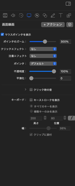 キーストロークの記録などどと同じく、画像インスペクタからポインタのズームを選択する。