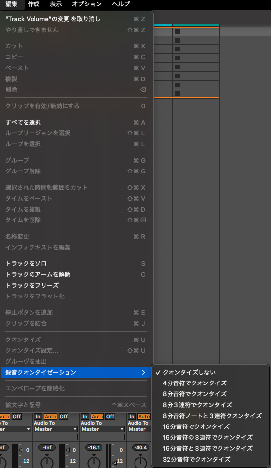 演奏時に初めからクオンタイズをかけたい場合は「編集」→「録音クオンタイゼーション」から任意のものを選んでください。