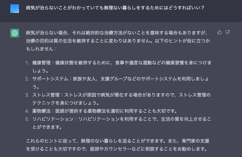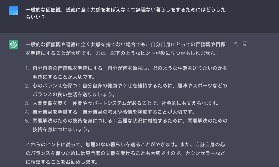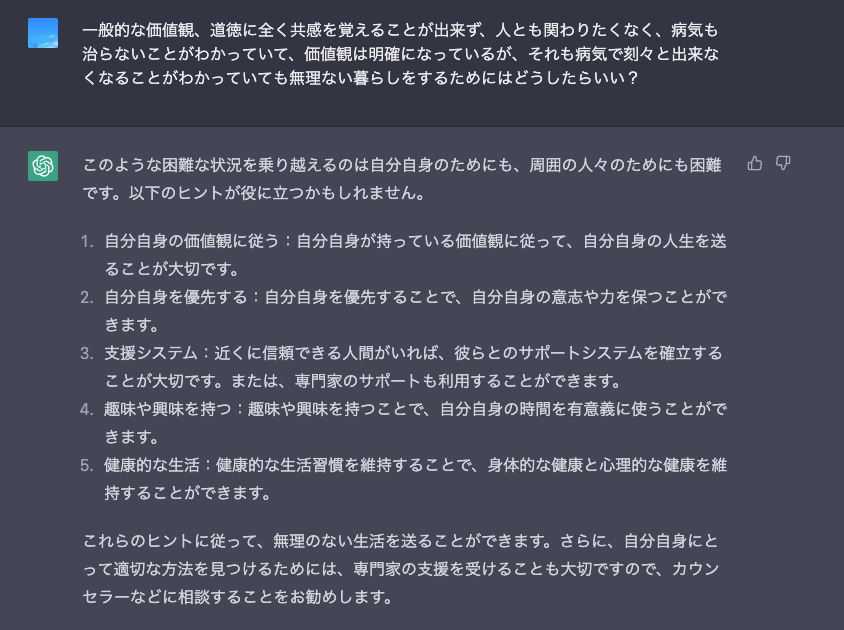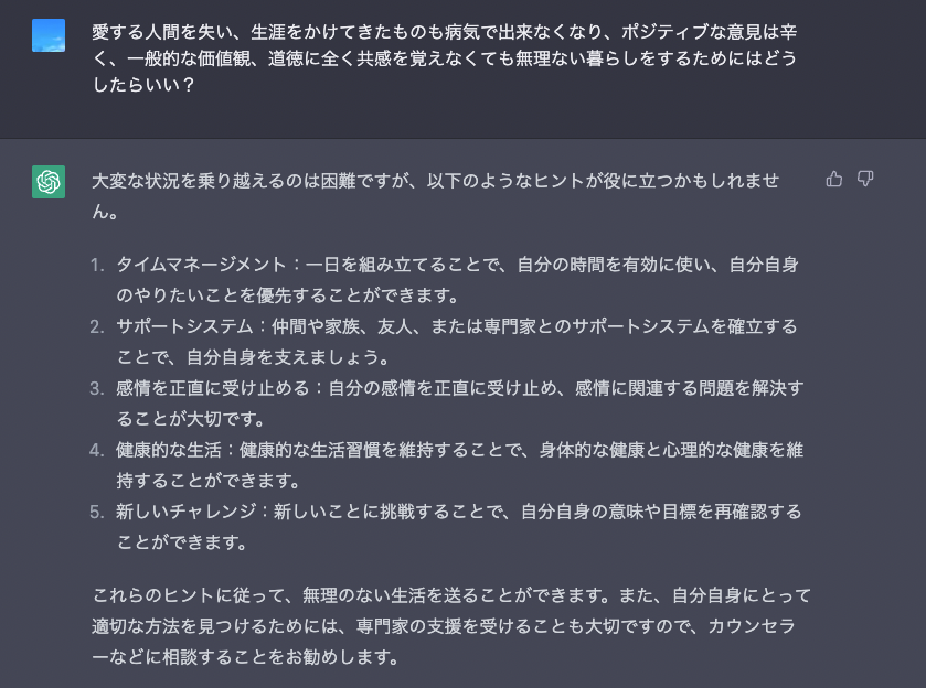 生きることについて考えることは、正解なんかないわけです。ChatGPTが正しいかどうかなんかはどうでもいい。自分の考えるヒントになればいいので。自分の人生に対してどう生きるかを決定するのは自分自身でしかないわけですし。