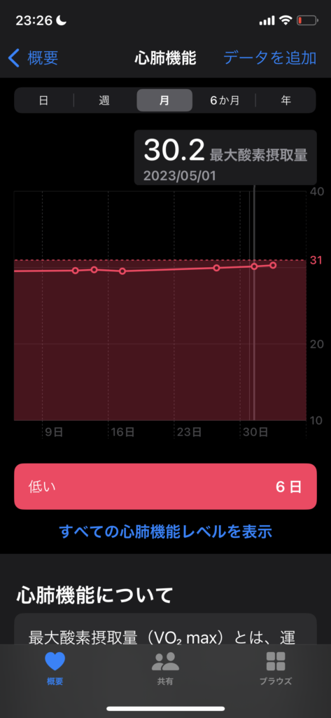 先月のVO2MAXは29.2。数値だけみると改善しているが、散歩に行かなかったのでそもそも計測機会が少なかった。
