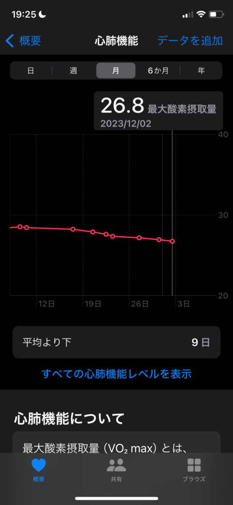 VO2MAXは26.8に。先月は28.7なのでまた低下。年初は30を超えるまで回復していたのが遠い日々ですね…