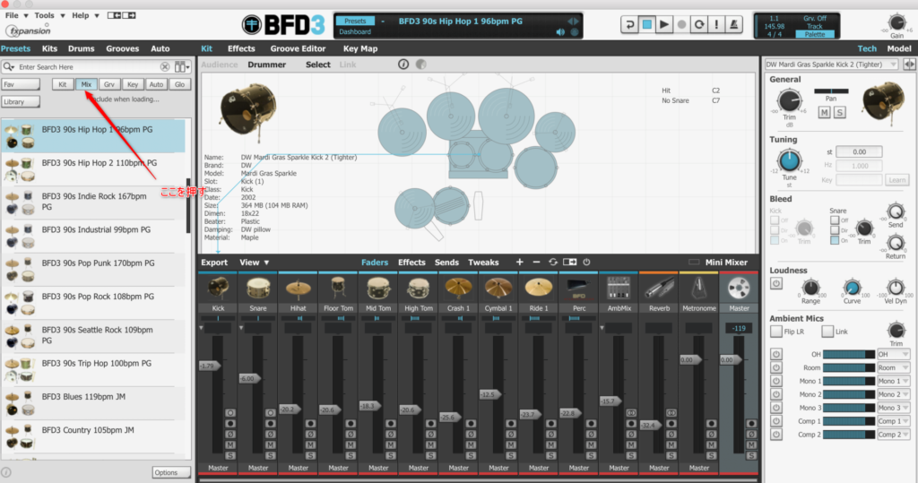 じゃあ、キットは気に入ってるんだけれど、マイクバランス(MIX)は変えたいという場合があるかもしれない。