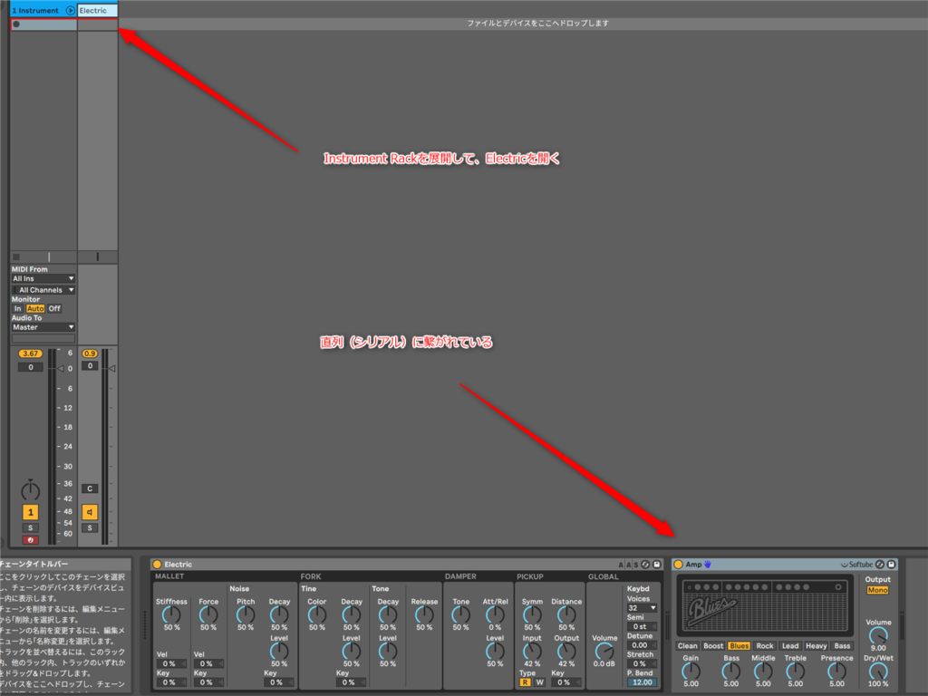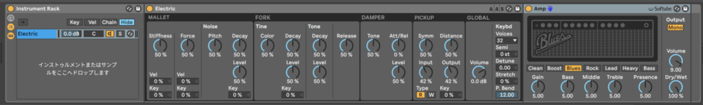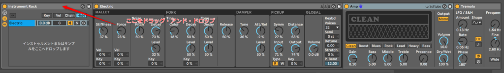 もう一つ方法があるよ。Instrument Rackを展開して、ElectricのトラックにAmpをドラッグ・アンド・ドロップする。