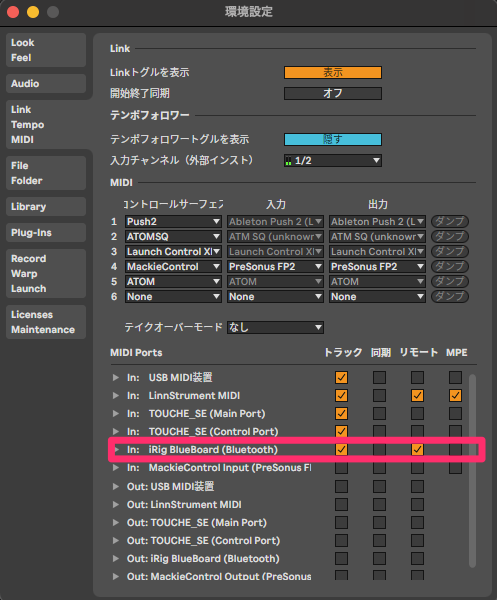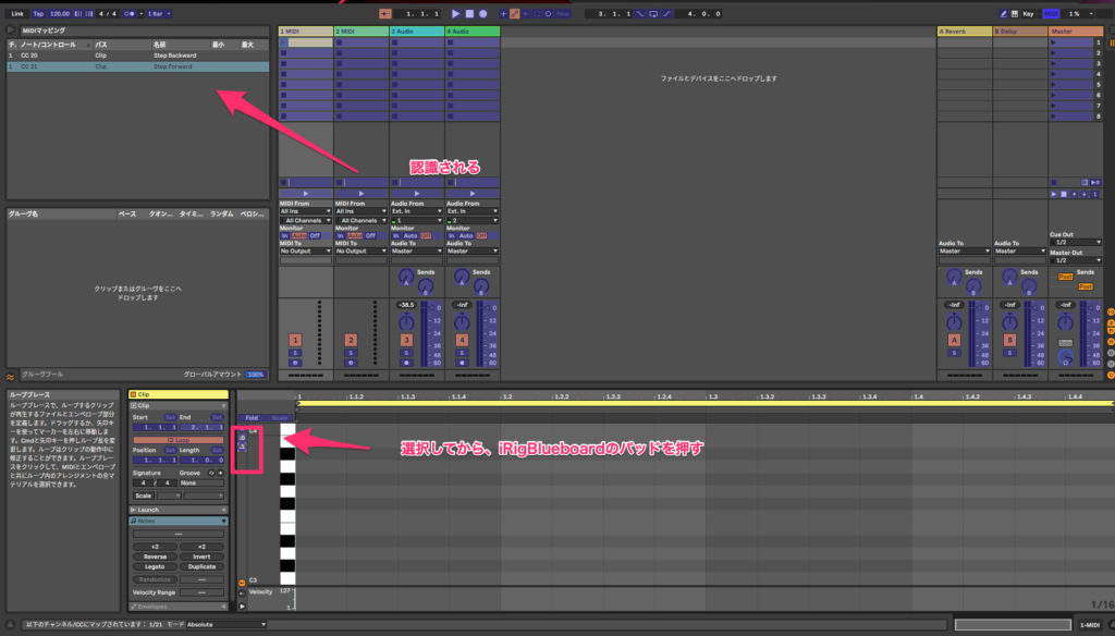 これに加えて、iRig Blueboardを加えることで、エクスプレッションペダルを使えるようになり、MIDIラーンをすればアレンジメントビューのトランスポートなんかも足元で行えるようになる。