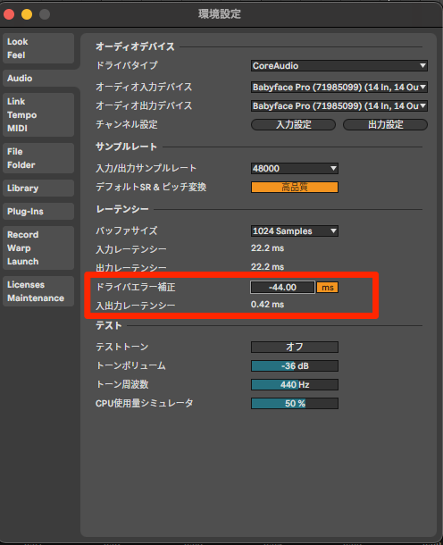 - ここで、ドライバーエラー補正値の絶対値と入出力レイテンシーの値を足します。どれくらい遅れてるかということを補正させるわけなので。(44.0ms+0.42=44.42ms)