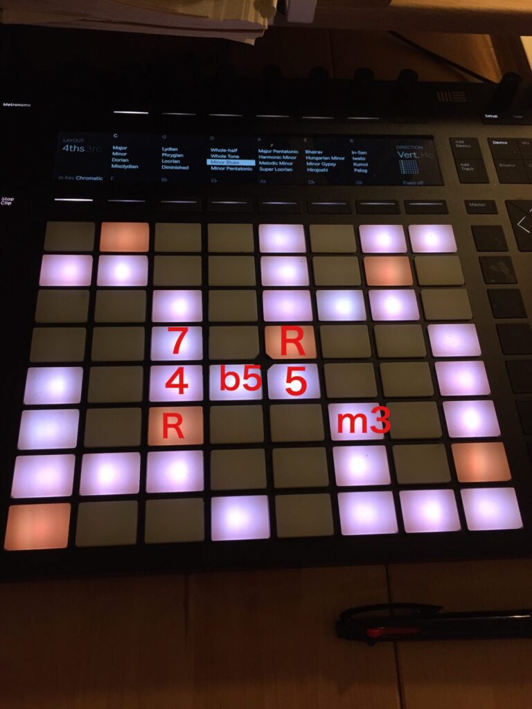 あえて、全部の度数は書いていない。ギターやベース演奏できる人なら、すぐわかるかも。そうでない人はMinor Bluesスケールにしてこの響きに慣れてみてね。そうすると光るから視覚的にわかるね。できれば響きを覚えるように、度数歌いながら弾くとええよ。