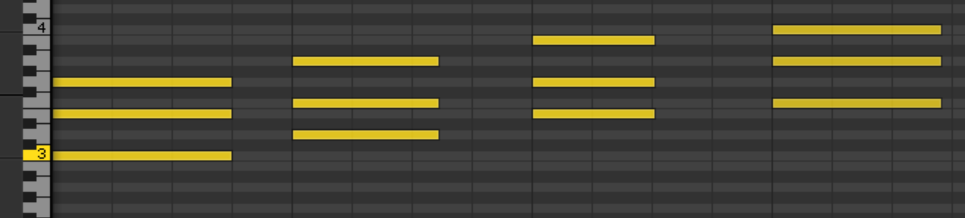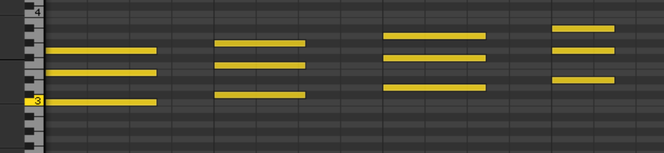 C,C#,D,D#のトライアドやね。こういう形で同じコードを半音移動する形でパッドを叩いて演奏できる。