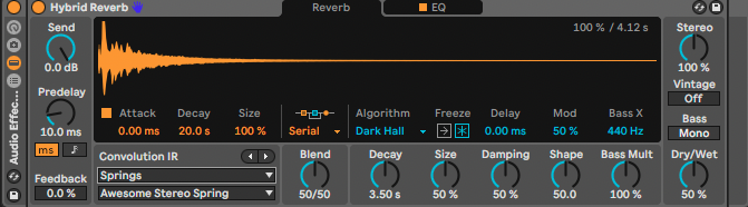ステレオで使いたい場合を考えて、Convolution RevrbのIRデータは、SpringsのAwesome Stereo Springを選択しました。EQはローカットを入れて、BassはMonoにしてます。