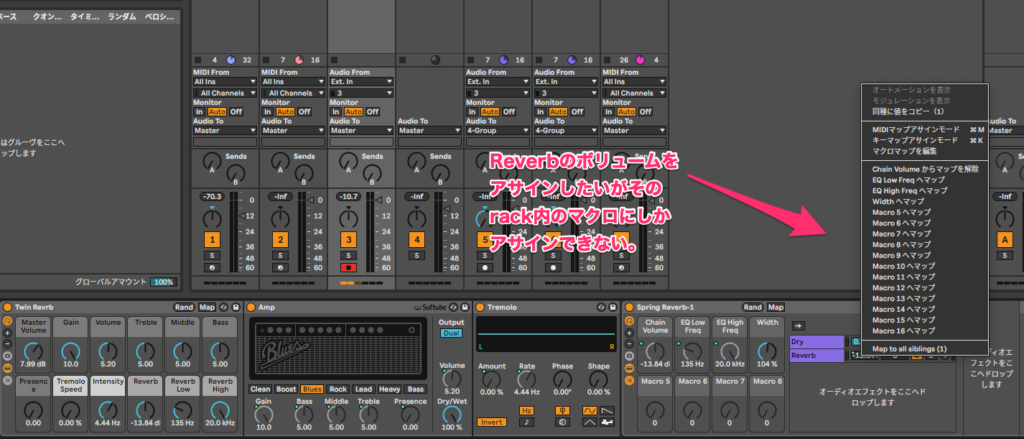 先ほどReverbはAudio Rackにしました。そちらでマクロをアサインしようとしても、そのrackのマクロにしかアサインできません。
