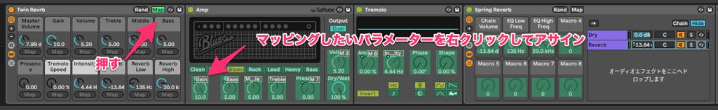 この場合だとReverbのラック内のマクロにしかアサインできない。アンプで音を出したいだけなのに、いちいち開かなければならない。こんなの面倒臭すぎますね。絶望です…