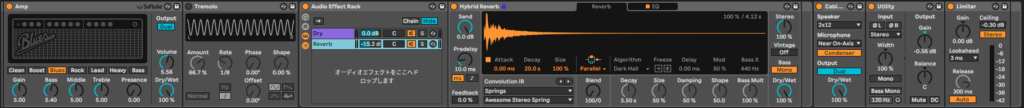 Amp→Tremolo→リバーブ(ラック使用)→Cabinet→Utility→Limiterの順番です。