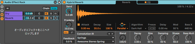 注意点としてはDry/Wetは100%ということです。Audio Effect Rackは要するにトラック内にセンド・リターンを作るのと同じことで、送り量でリバーブのかかり方を変えるからですね。
