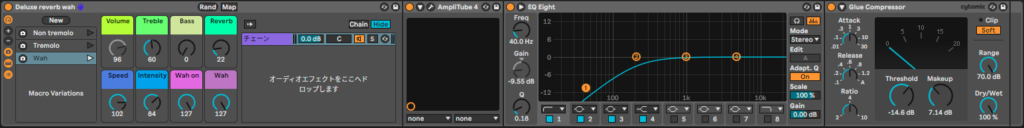 必要なエフェクトを立ち上げてラックを作っておく。例えば、ワウのオンオフなんかも画像のように作っておきます。エクスプッションペダルもマッピングしておくと捗りますね…