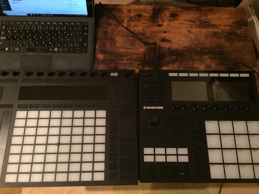 操作は若干複雑なものの、パッドを叩くこと中心で形を作りやすいのがMaschine mk3、操作は覚えたら高速で出来るものの、自由度の高さが難しさにもなるAbleton PUSH2。