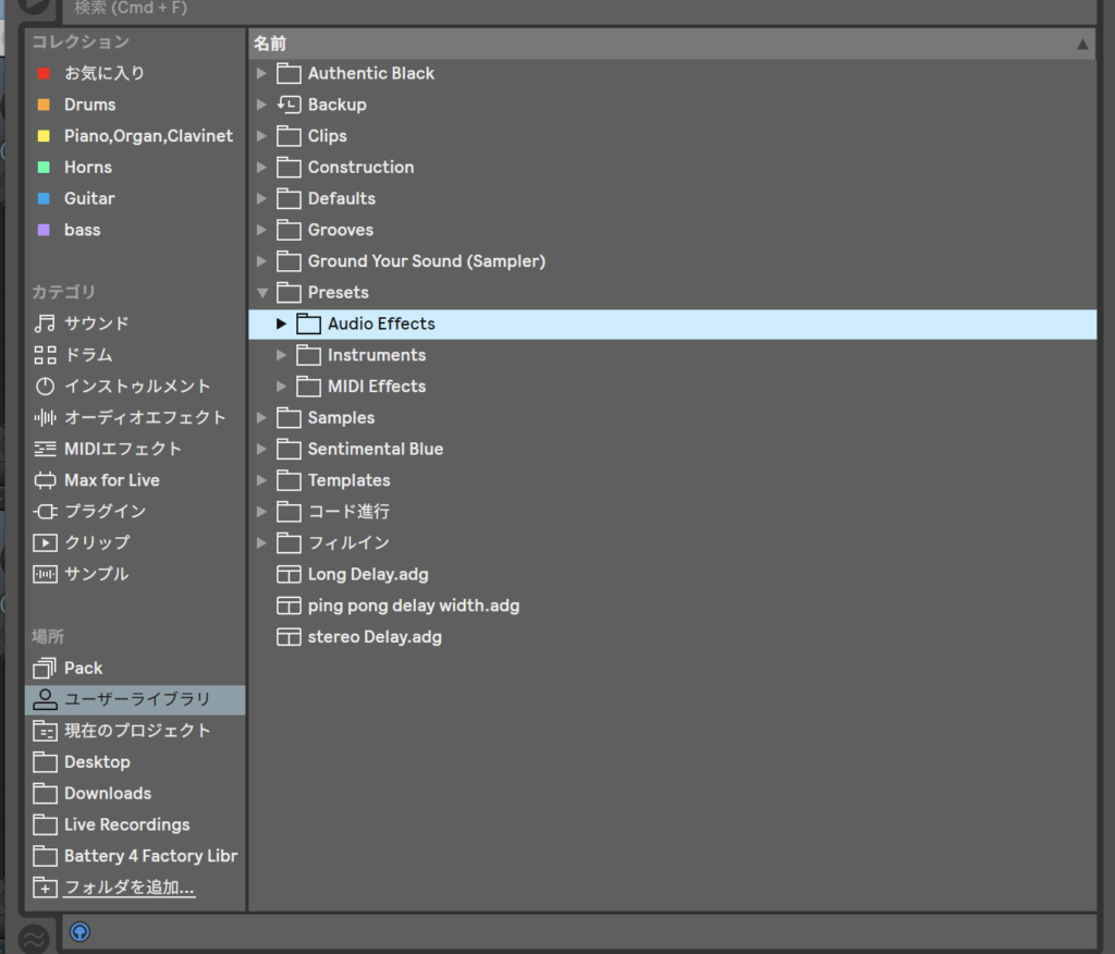 まずは、ユーザーライブラリを開く。そこから「Presets」→「Audio Effects]を選択