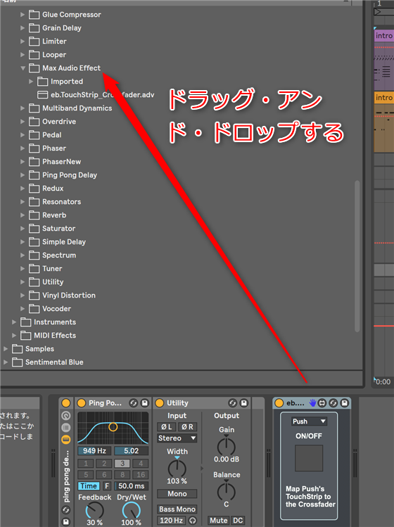 今回は、Touchstrip_Crossfaderというものをダウンロードしたよ。PUSHのタッチストリップでクロスフェーダーいじれるやつだね。いやあ、面白いのたくさんありますよ…