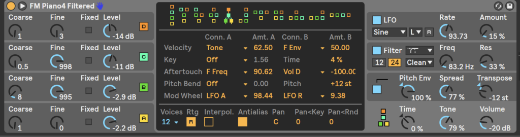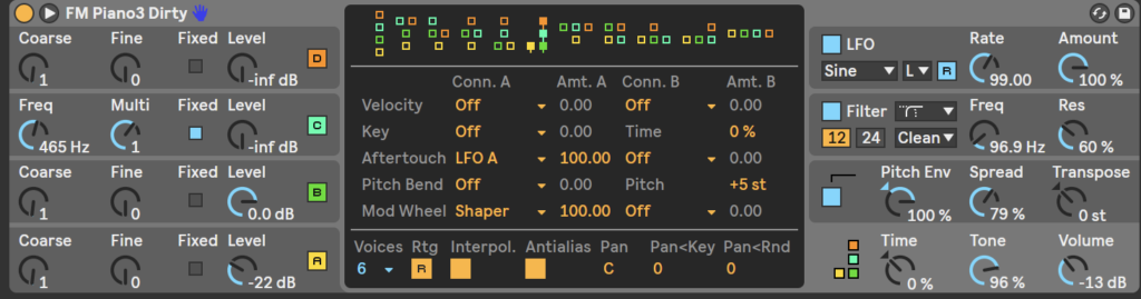今までの物をまとめると、オペレーター2つで、エレピサウンドを作るんなら、倍音部分、基礎部分という2つを1つで担うようにすればできるんちゃう?素人考えやけど。