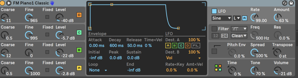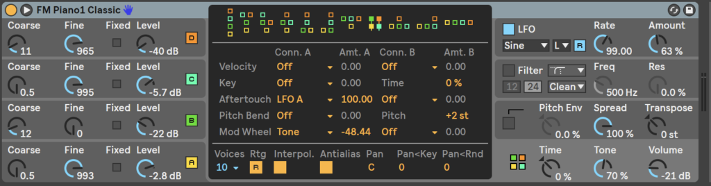 うん。もっといじろうと思ったらいじれるけど、FMのエレピに関しては理屈はわかったかな。アタックのノイズの感じが強いから、そういうときはフィードバック下げればいいのね。あるいは、モジュレーターの音量を下げてもいいのか。