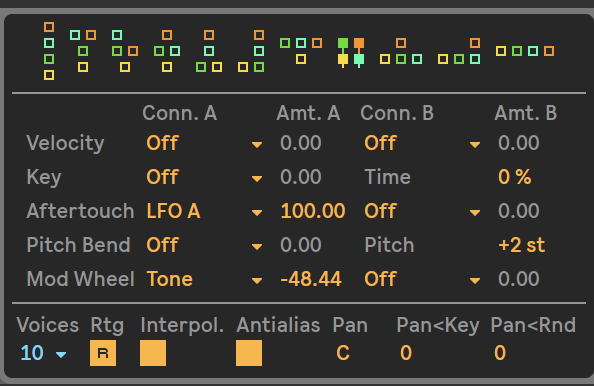 また、注目するべき点は、モジュレーターのVelが高く設定してあること。モジュレーターに関しては100%から考えて調整すればいいということか。音色変化がベロシティに応じて起こる。