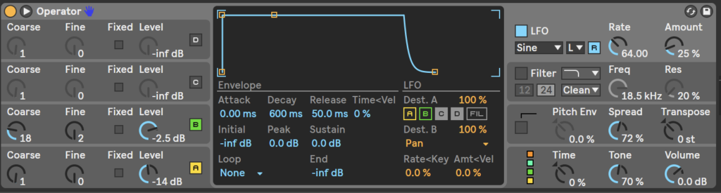 また、オペレーターA,Cに関しては、ADSRがほぼ同じ。これは音がなる側の音量の時間的変化は同じにしたいということと考えればいい。ここは別にアナログと同じやな。