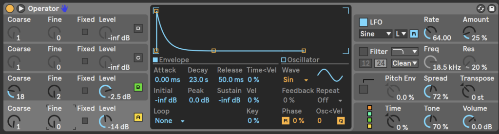 『FMシンセの新しいトリセツ』を参考にしながら作ろうと思ったけど、DX7を基準にしてるから6オペレーターなんだよね。Operatorは4オペレーターだから、当然そこまで複雑には出来ない。もちろんRackを使って工夫したらできるやろうけど、まずはOperator単体で作れるようになりたい。