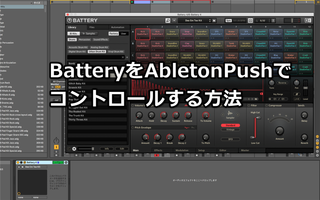 BatteryをAbletonPushでコントロールする方法 先日、PUSH勉強会をやってきた時、Kurtさんは、ドラム音源はBatteryを使うとおっしゃってたんだよね。 https://murinaikurashi.com/push-workshop13/ なんで、PUSHでBatteryを使う方法を2つ説明するね。 正統... -