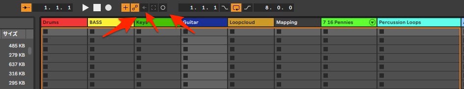 動画だと早すぎたかもしれませんので、セッションビューでオートメーションをリアルタイムで録音するときに必要な謎のボタン類について書いておきます。矢印左側からの説明です。