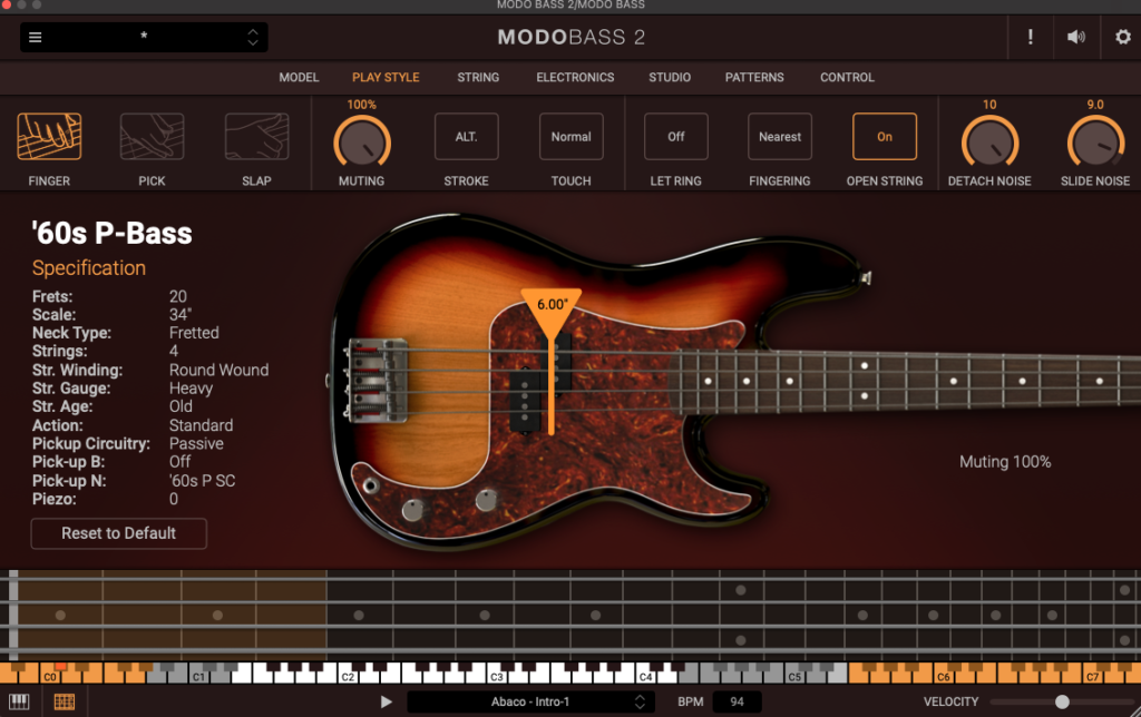 またミュート、死んだ弦のシミュレートなどが出来る。サンプル音源のほうが音としては存在感があるが、奏法の再現度は圧倒的に高いため。