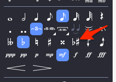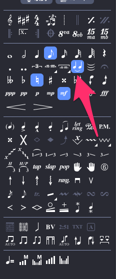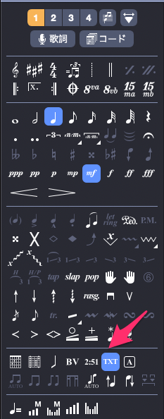 コードネーム付記 音符をクリックしてTXT(T)を押すと入力モードになる。歌詞などにも使えるか。アンティシペーションしているところなどに使える。マスターリズム譜なんかの作成も簡単そう。