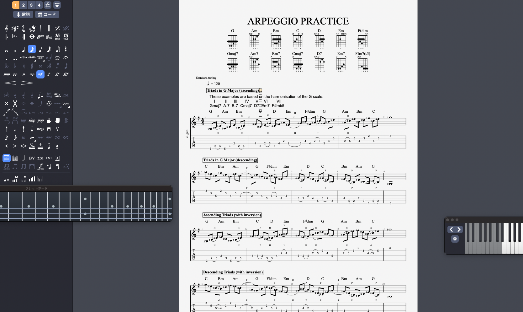 ノートの削除 鍵盤かギターのフレットボードから削除 cmd+-で該当拍を削除できる,本来はdeleteで消えるはずなのだが上手く機能していない。