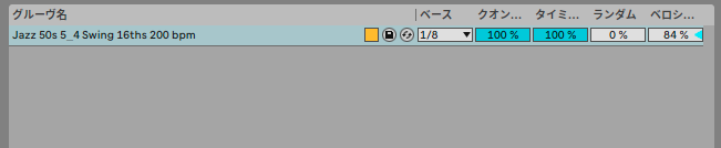 新規MIDIクリップを作ると、グルーブファイルが読み込まれるから、スクエアで打ち込んだリズムもスイングでその瞬間に再生できます。