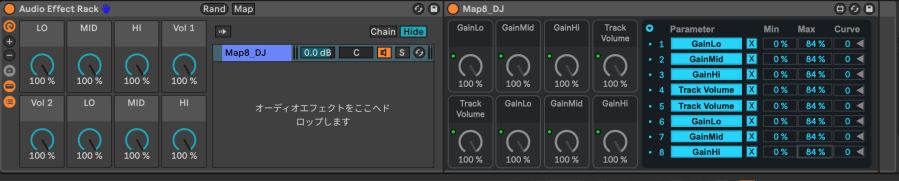 Ableton Liveの中のMap8にはTrack Volumeとかアサインしたパラメーターの名前が出てます。