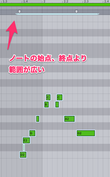 どういうことか。こういうことです。多くの場合、マウスでノートを選択されることが多いと思います。この上の謎の水色の線がありますね。これが選択エリアです。