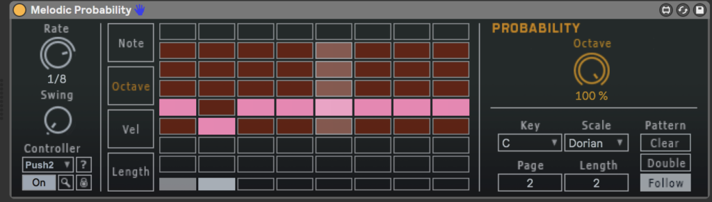 右側のランダムは、そのノートがオクターブ上に行くかとか、ベロシティはどうとか、長さとかやね。