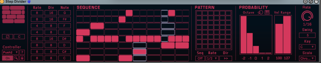 もう一つのドラムはStepDividerで適当にランダムで作ったパターンを再生しているだけ。