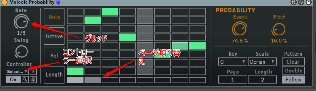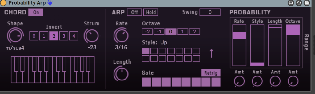 横のProbabilityはRateがグリッド、Styleがアルペジエイター。これはLiveのアルペジエイターと同じちゃうかな。