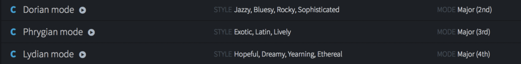 Dorianみてみようか、MODEがMajor(2nd)となってる。CドリアンはBbメジャースケールの2番めから始まってる。チャーチモードってそういうものだけどさ。でも、これ見て、マイナー系統のスケールってわかるんやろうか…