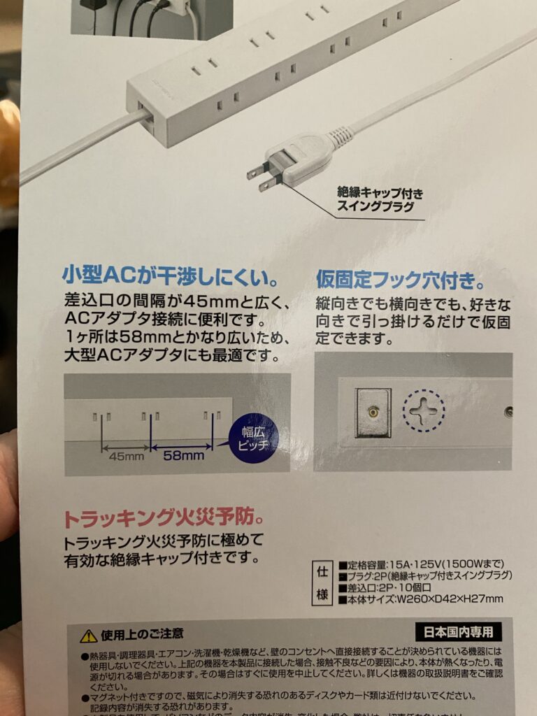 一番大きいのは10個口の配線があることですね。とにかく電源が必要となる場合にいちいち複数のタップを使うのは面倒くさい。掃除も大変ですし。ケーブル絡まって転んだりしたら絶望ですからね…