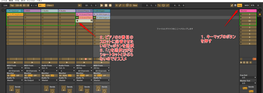 だから、スロットに一つ一つに録音できるとええよね。MIDIラーン使うと簡単やね。