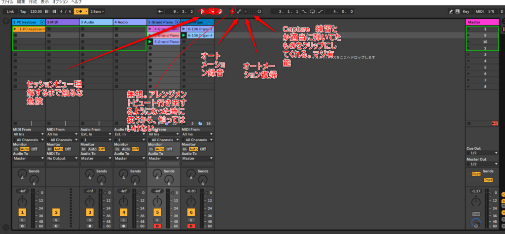 オーバダビングする時どうするのって疑問があるよね。その時は、アーム状態にしてからセッション録音ボタン押せばに録音できるからね。アレンジメントビューと操作が違うから、ちょっと混乱しやすいかもしれんね。