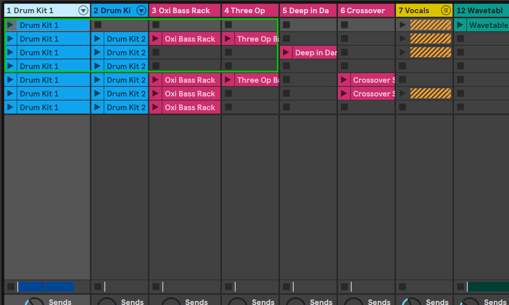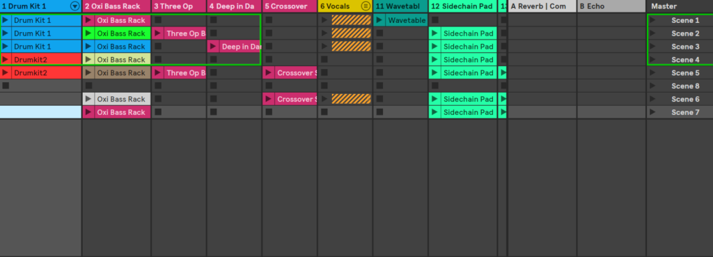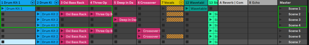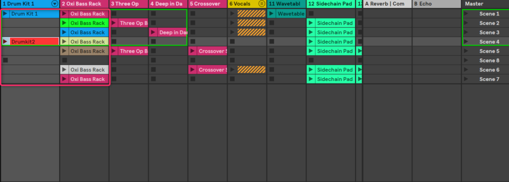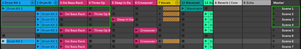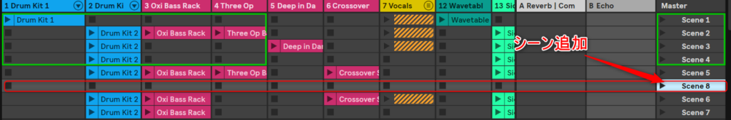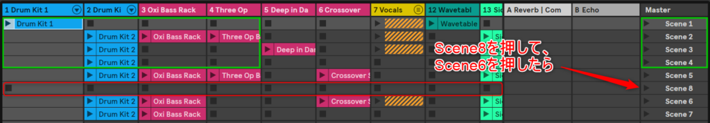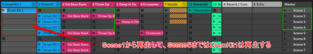 そうやね。Scene6に同じクリップをおけばいい。そしたらScene7をおしてもDrumkit1は再生できる。